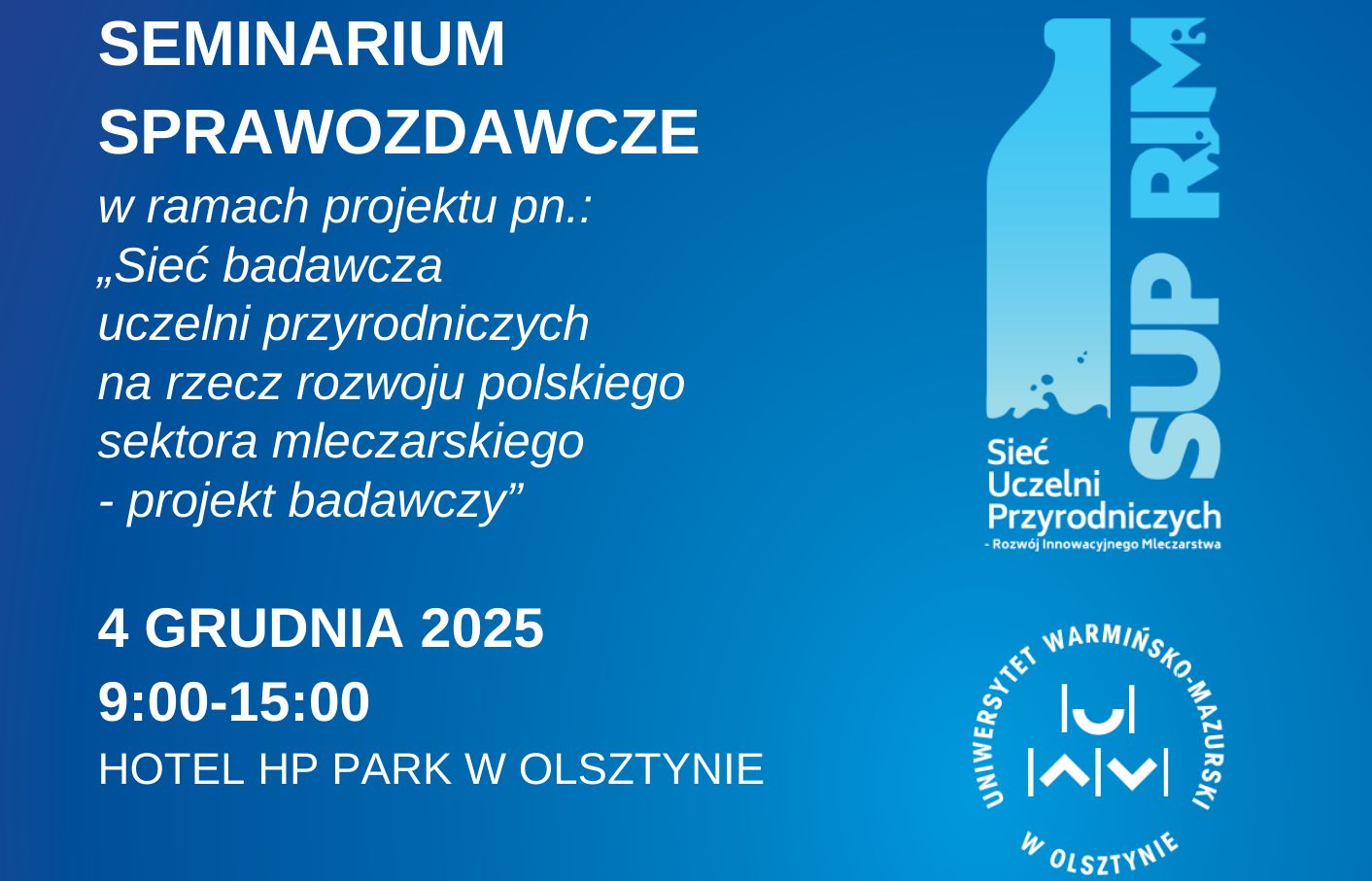 Serdecznie zapraszamy na seminarium sprawozdawcze projektu: „Sieć badawcza uczelni przyrodniczych na rzecz rozwoju polskiego sektora mleczarskiego - projekt badawczy", które odbędzie się dnia 4 GRUDNIA 2025 ROKU, W GODZ. 9:00 - 15:00 w Hotelu HP Park w Olsztynie.